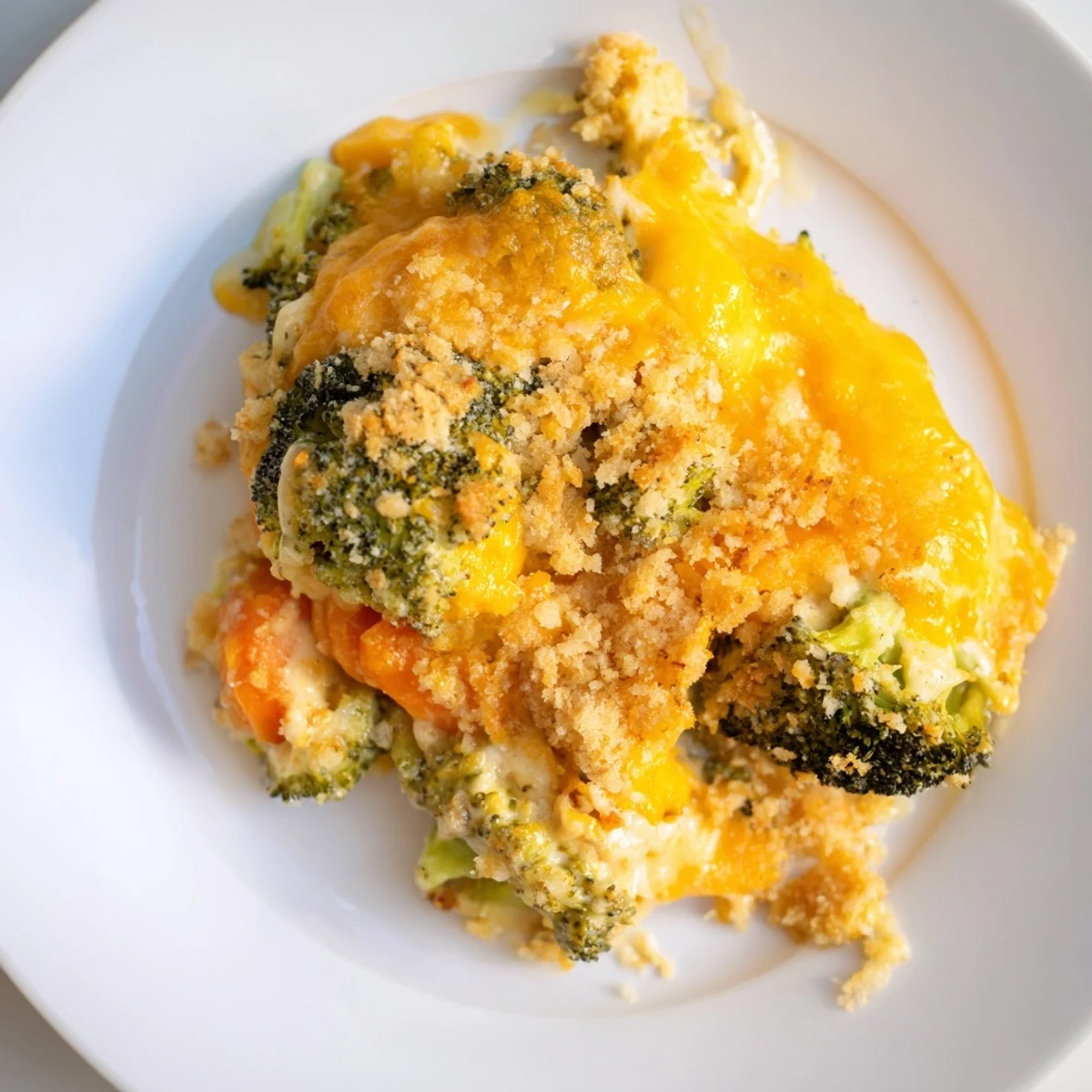 Steam broccoli and sliced carrots briefly until just tender. Make a cheddar sauce by whisking flour into melted butter, adding milk until thick, then melting in shredded cheddar with garlic and onion powders. Fold vegetables into the sauce, transfer to a greased baking dish, top with panko mixed with butter and Parmesan, and bake at 180°C (350°F) for 25–30 minutes until golden. Let rest 5 minutes before serving; try Gruyère, a pinch of nutmeg, or added protein for variation.