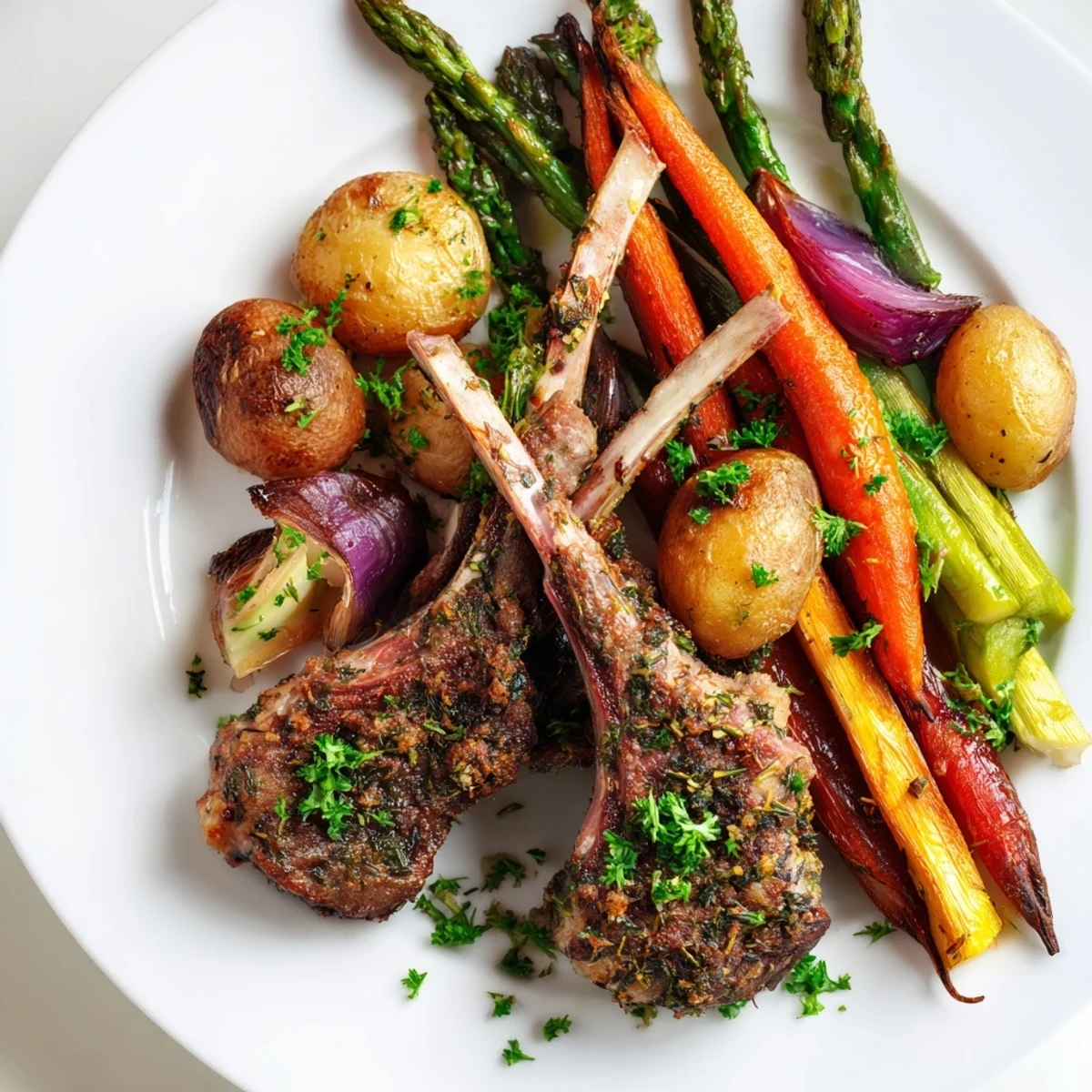 This all-in-one Easter dinner brings together herb-crusted lamb chops with baby potatoes, carrots, asparagus, and red onion. Everything roasts together on a single sheet pan, letting the flavors meld while keeping cleanup minimal. The lamb gets rubbed with fresh rosemary, thyme, garlic, and lemon, while the vegetables develop a delicious caramelized edge. Perfect for feeding 4 people in just one hour, this hands-off main dish lets you enjoy the holiday instead of being stuck in the kitchen.
