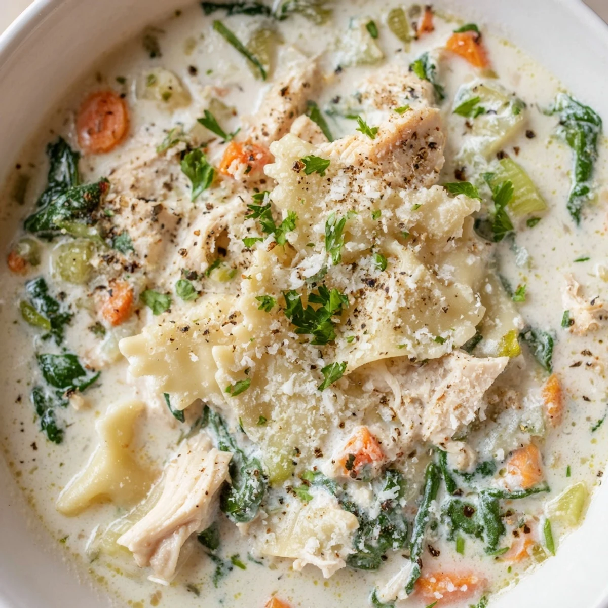 This hearty Italian-style soup captures all the flavors of traditional white lasagna in a comforting bowl. Tender pieces of chicken simmer with aromatic vegetables, broken lasagna noodles, and a blend of Italian herbs before being enriched with heavy cream and a trio of cheeses—ricotta, mozzarella, and Parmesan.