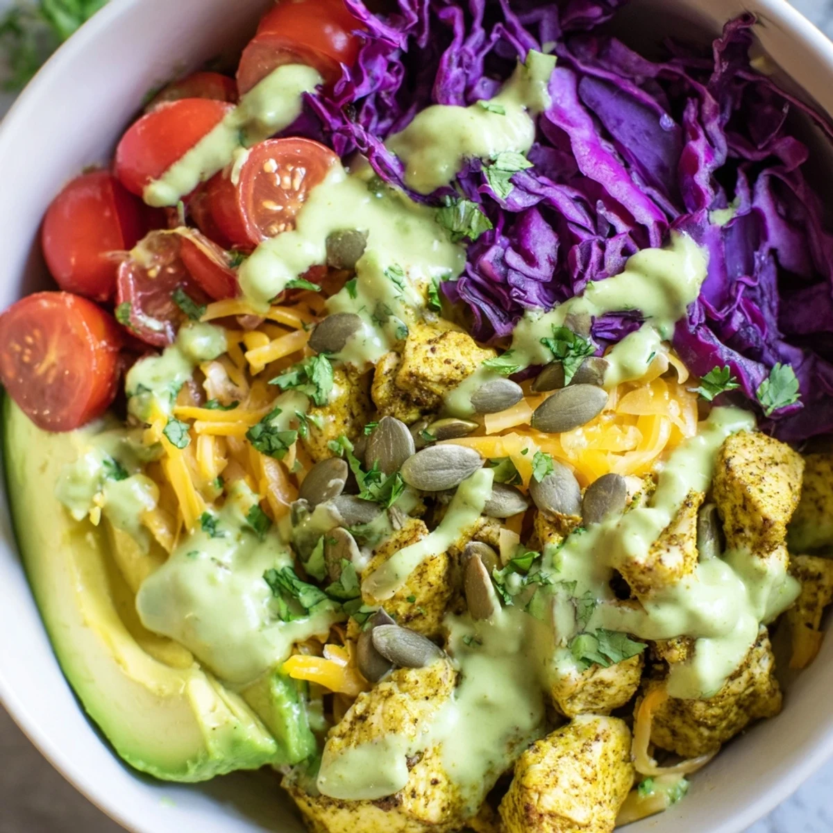 These customizable keto bowls combine tender seasoned chicken with crisp romaine, cucumber, bell peppers, cherry tomatoes, and red cabbage. The star is the velvety avocado dressing, blended with Greek yogurt and lime for perfect tangy richness. Each bowl gets topped with shredded cheese, pumpkin seeds, and fresh cilantro for crunch and flavor. Ready in just 30 minutes, these bowls offer endless variations—swap chicken for grilled steak or shrimp, adjust vegetables to your liking, and make them dairy-free with simple substitutions.