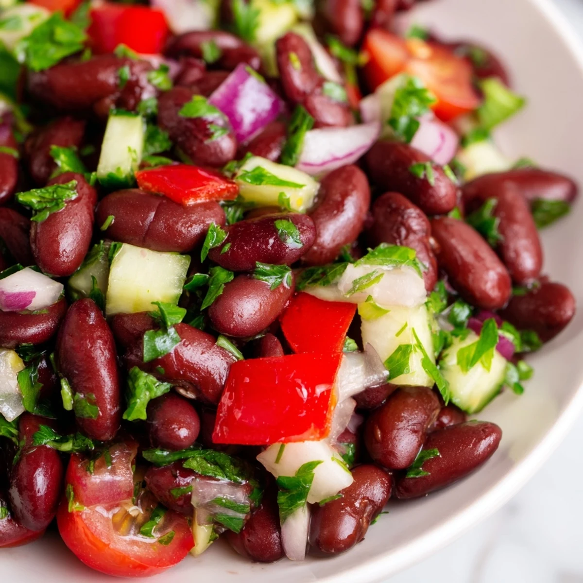 This refreshing kidney bean salad combines protein-rich legumes with crisp red bell pepper, cucumber, cherry tomatoes, and aromatic red onion. A simple whisked vinaigrette of olive oil, red wine vinegar, and Dijon mustard ties everything together. The salad comes together in just 15 minutes with no cooking required, making it perfect for meal prep, quick lunches, or potluck gatherings. Chill for 30 minutes before serving to let flavors meld beautifully.