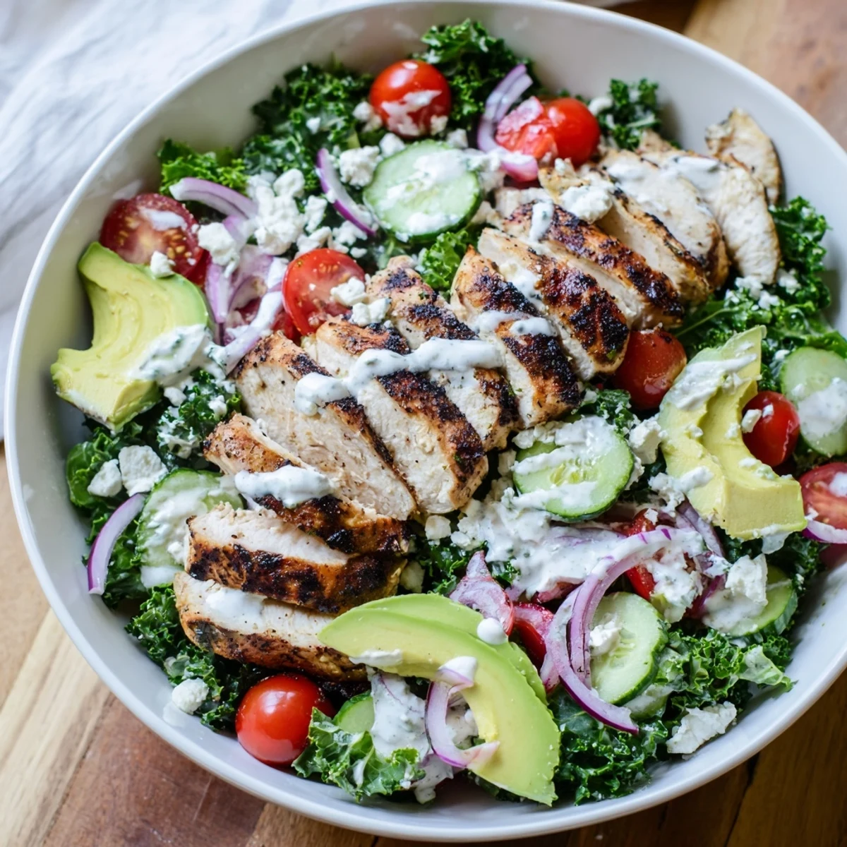 - Divide massaged kale among four bowls. Top with sliced chicken, tomatoes, cucumber, red onion, avocado and crumbled feta.
